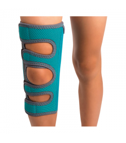 Órtesis inmovilizadora de rodilla pediátrica confeccionada en rizo por su parte interior y de panal transpirable en su parte exterior.